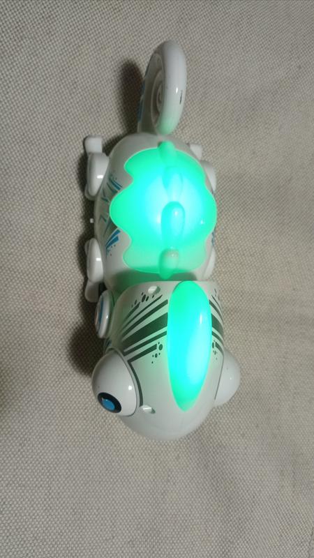 В отличную погоду. Крутит глазами, веляет хвостом, меняет цвета. Но должен быть пульт, пульту нет. Так что можно играть как с машинкой, колеса инерционные. Игрушка дорога, 50 евро в магазине.