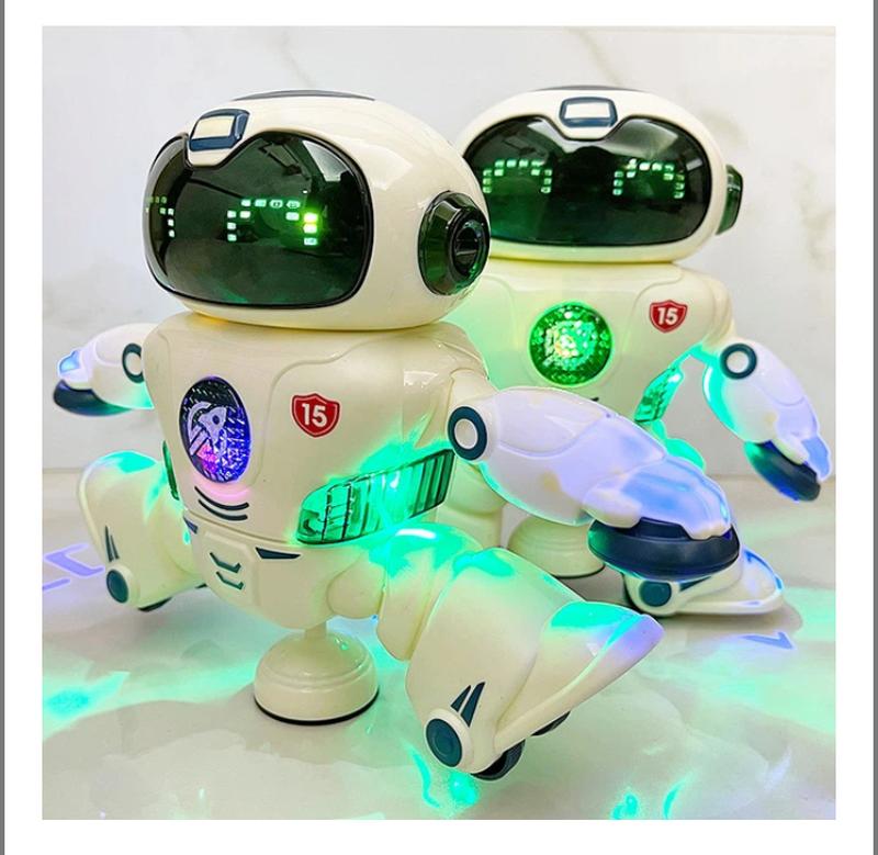 Стан ідеал. Все працює. Танцюючий робот Hiblin Дитячий робот, що танцює та вміє їздити боком, обладнаний звуковими та світловими ефектами. Модель виконана в білому кольорі з лаконічними вставками по всьому корпусу. У руках у нього світлові диски, які проєктують яскраво-синім кольором. Іграшка-робот дуже кумедна, з музикою, яскравими вогнями та може обертатися на 360 градусів. Різкі рухи, повороти, музика та яскраві світлодіодні спалахи безсумнівно привернуть до нього ще більшу увагу малюка. Працює від 3 батарейок типу АА (до комплекту не входять). Розмір робота 18х6х18,5 см.