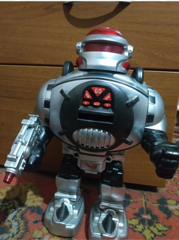 Робот, стріляє дисками, ходить, повертається, світиться, балакає. Розмір висота 30см. ширина 20см. Дуже в гарному стані ,але не має пульта радіокерування. Керування на кнопках з спереді. Працює на чотирьох пальчикових батарейках які ідуть в комплекті.