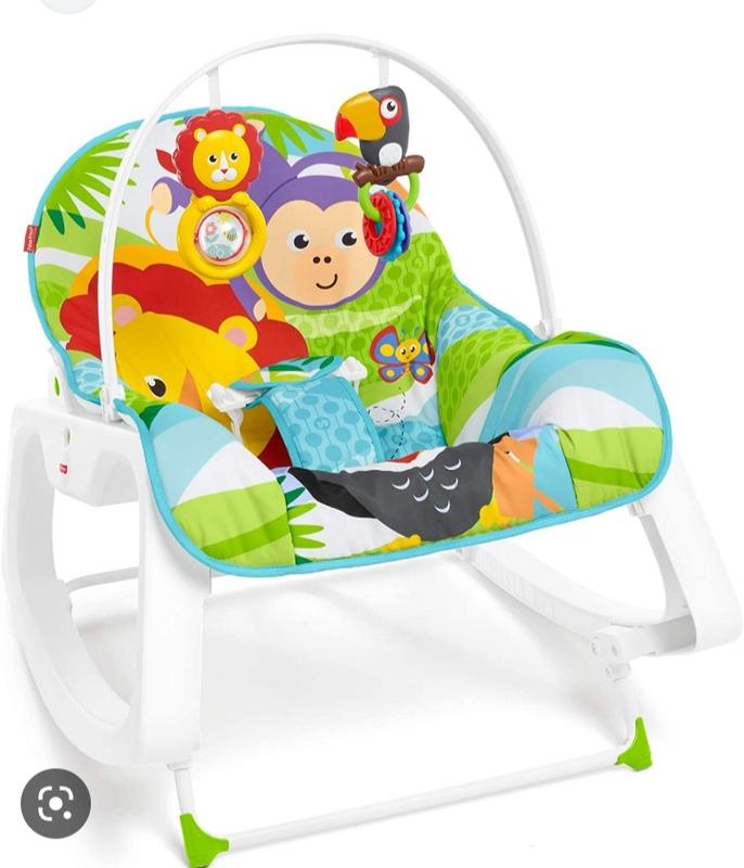 Крісло-гойдалка шезлонг, від народження до 18 кг. -крісло оснащене ігровою дугою, яку можна зняти -крісло може гойдатися механічно або нерухомо -два положення спинки - має вібромасажер, "автомобільне заколихування" стан гарний, є трішки слідів використання та маленьку плямку(вказала на фото), все робоче, ремінці справні
