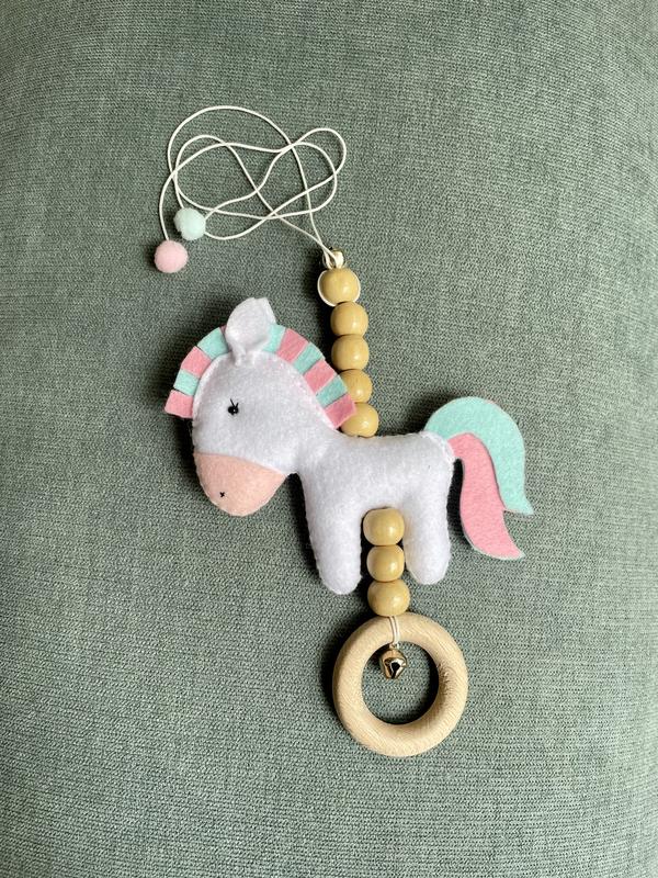 Іграшка виготовлена з американського фетру (гіпоалергенно) бусени та кільце зроблені з дерева. Запакована у святкову коробку, тож може бути гарним подарунком. Іграшку можна вішати як в коляску так і в ліжечко замість мобіля.