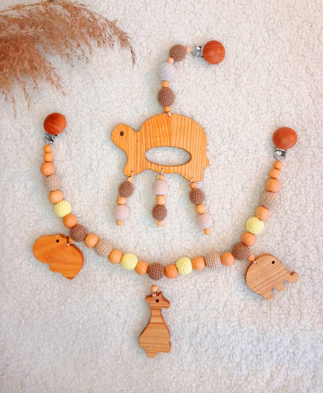 Набір підвісних іграшок для дитячого візочка ручної роботи. Набір з іграшок - 1 герлянда та 1 підвіска. Іграшки дуже яскраві та привертає увагу малюка, заспокоюючи його. Іграшка кріпитися до капюшона коляски за допомогою спеціальної прищіпки. Підвіска для коляски. Підвісна іграшка для коляски. Іграшка для коляски. Гірлянда для коляски. Подарунок новонародженому.