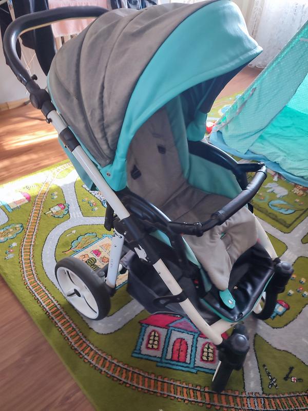Маневренна,великі колеса,добротна у нормальному стані,повертається обличчям до мами і вперед,містка корзина,ручка опускається.