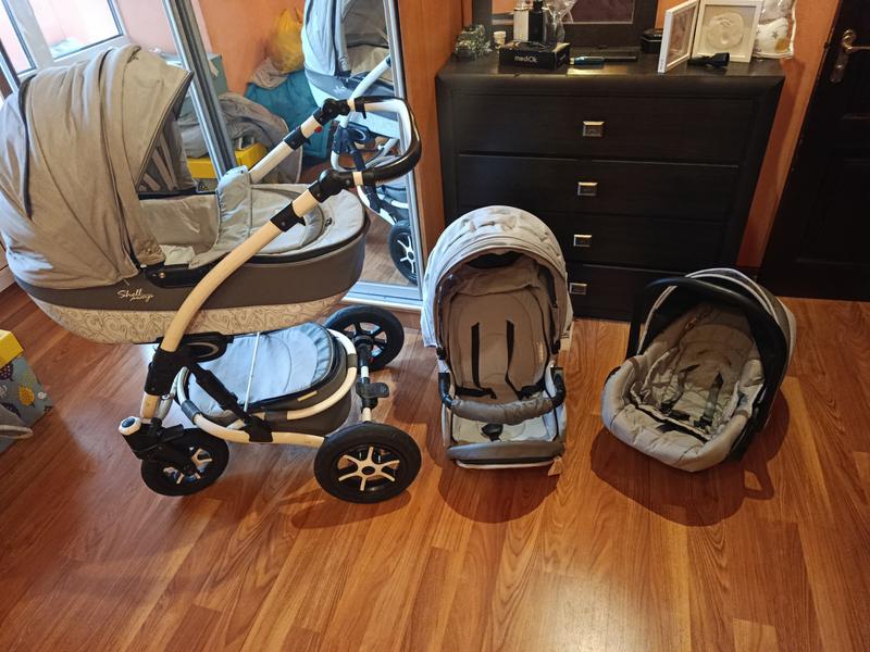 Амортизация задних колес и пневматическая (вздушная) амортизация рамы коляски, для мягкого передвижения по неровной дороге. Есть накидки на ноги для всех трех видов, дождевик, москитная сетка и большой багажник из низа коляски. Ручка регулируется по высоте. Есть визуальные внешние царапины. В. люльке регулируется подъем головы. Сиденье мягко разложить в лежащую форму, и регулировать подставку для ног ребенка. Автокресло мою регулируемую ручку для переноса ее в руках и накидку если для ребенка она будет больше.