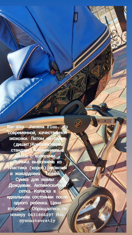 Коляска Junama Fluo. З сучасної, якісної екошкіра. Влітку не парить (дише)Комплектація стандарт: Алюмінієві шасі з колесами . Люлька виконана з пластика (короб) екошкіра і жакардових тканин . Сумка для мами . Дощовик. Антимоскітна сітка. Коляска в ідеальному стані, після однієї дитини. Ціна 8500грн . Звертайтесь за номером 0631866297 Яна.