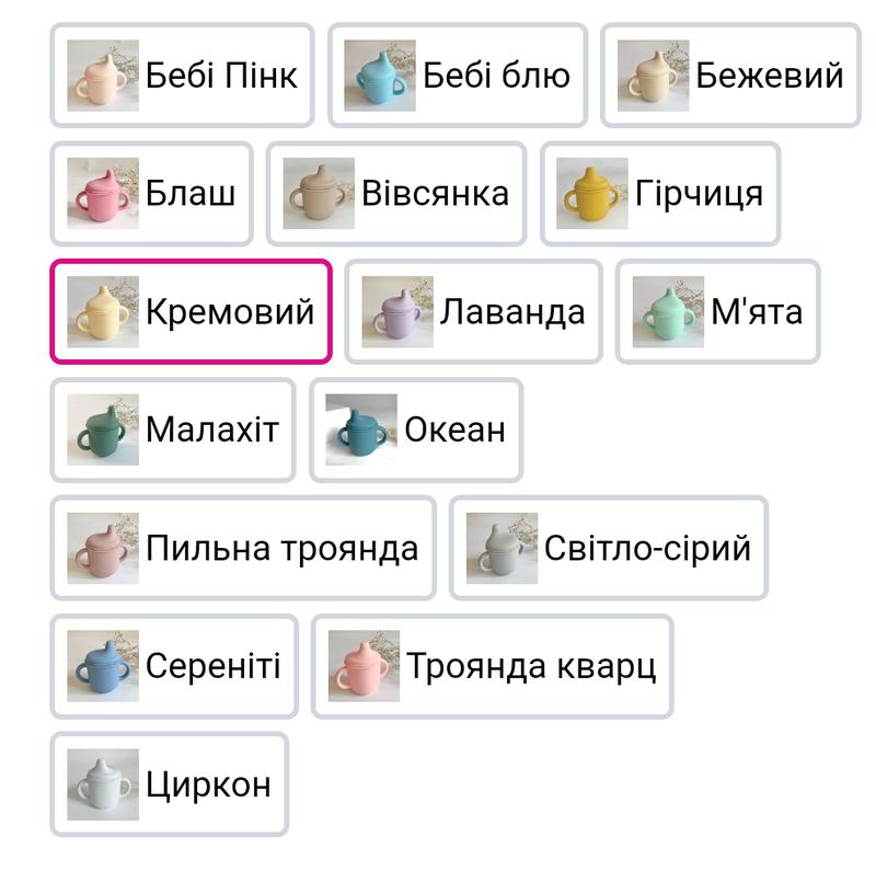 Силіконовий поїльник дуже необхідна річ для першого прикорму. Він дуже зручної форми та завдяки двом боковим ручкам дитині зручно самостійно тримати чашку в руках та вчиться пити. Силіконова філіжанка непроливайка підійде діткам від 6ти місяців. Надалі Ви можете прибрати кришку та використовувати поїльник як звичайну чашку. Загальні характеристики Склад : Харчовий силікон Тип : Поїльник з носиком Колір: Бебі Пінк, Бебі блю, Бежевий, Блаш, Гірчиця, Кремовий, Лаванда, Малахіт, М'ята, Вівсянка, Океан, Пильна троянда, Троянда кварц, Світло-сірий, Сереніті, Циркон Фурнітура