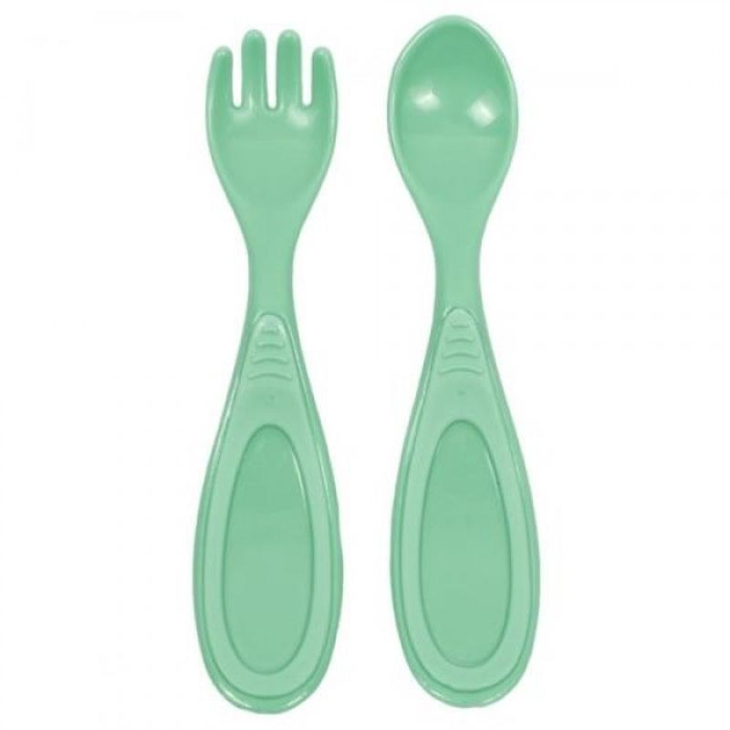 Набір приладів для годування (ложечка + вилочка). Прилади не токсичні, не б'ються, зручні у використанні. Ручка виготовлена таким чином, щоб її було зручно тримати в руці. Довжина приладу: 13 см. Для дітей від 4-х місяців.