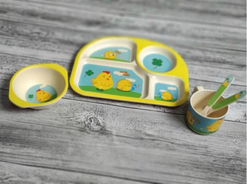 Дитяча бамбукова посуд 5 предметів Курча Дитячий посуд з еко – волокон бамбука. Складається з безпечних органічних компонентів природного походження. Володіє неймовірно приємними тактильними властивостями. Яскраве забарвлення покращує апетит і підніме настрій. Комплектація (5 предметів): велика тарілка з роздільником, габарити 20.5 х 26.5 х 2.5 см; глибока миска, діаметром 11 см і глибиною 4 см; чашка, висотою 6.5 см і діаметром 7.5 см; ложка, довжиною 13.5 см; вилка, довжиною 13.5 див. Основні переваги бамбуковій посуду над посудом з інших матеріалів: антибактеріальність; високі гігієнічні властивості; простота догляду; відсутність токсичних компонентів. Температура використання: від 0 до + 80 °С. Можна мити в посудомийній машині.