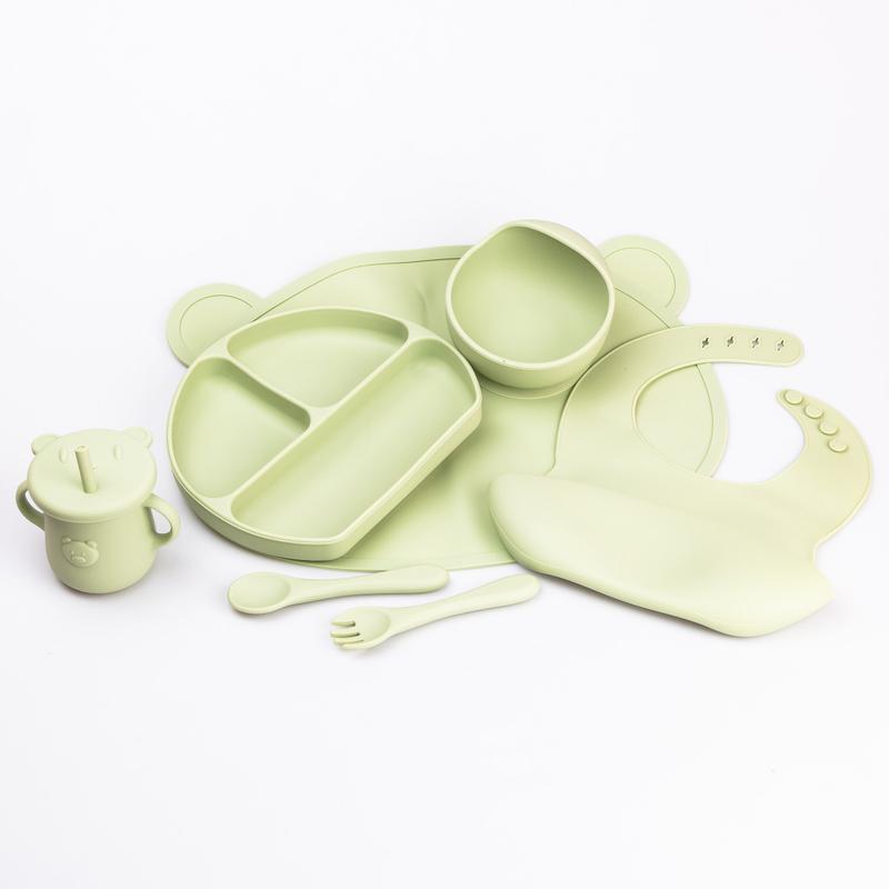 Цей практичний та безпечний набір посуду, виготовлений із харчового силікону, стане чудовим подарунком для вашого малюка. Набір складається з 7 предметів: тарілки, глибокої тарілки, ложки, виделки, поїльника, слинявчика та килимка. Силікон не б'ється, не дряпається, не деформується і легко миється, що робить його ідеальним для дітей. Тарілка має присоску, яка фіксує її на столі, а глибока тарілка підходить для перших страв та каш. Ложка та вилка мають закруглені краї для безпеки дитини, а поїльник оснащений силіконовою трубочкою, яка не протікає. Слинявчик захищає одяг від попадання їжі, а килимок не ковзає по столу та захищає його від забруднень. Набір силіконового посуду для дітей із 7 предметів — це відмінний вибір для годування вашого малюка, адже він поєднує в собі практичність, безпеку та яскравий дизайн. Зверніть увагу: Перед використанням рекомендується простерилізувати посуд. Не використовуйте посуд у мікрохвильовій печі
