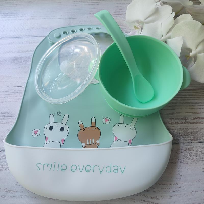 Дитячий силіконовий посуд Дитячий посуд із якісного харчового силікону Є безпечним для ваших діток Зручний у користуванні Легко миється Можна гріти в мікрохвильовій печі Не деформується Комплектація: Глибока тарілочка на присосці із силіконовою прозорою кришкою + ложечка, нагрудник з принтом Колір: м'ятний Всі фото вживу