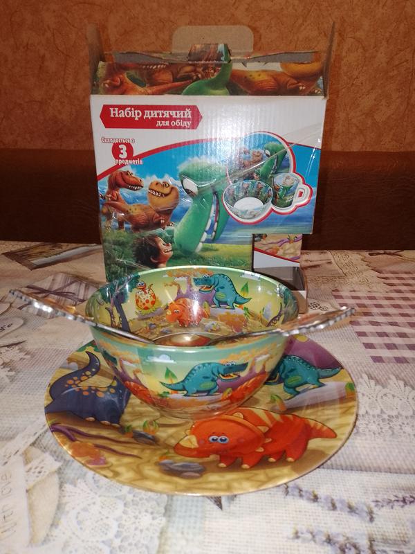 Набір дитячий для обіду "Динозавр" ,складається з 4 предметів тарілка мілка діаметр 200 мм,тарілка глибока 300 мл,виделка і ложка, чашки,нажаль немає. Новий набір коштує 400 грн,за відсутності чашки,продаю за 250 грн.