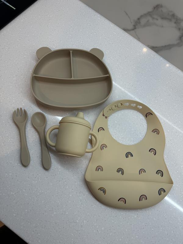 Дитячий силіконовий посуд В комплект входить: Миска роздільна на присосці Поїльник 2 нагрудники Прибори Все має позначи якості, це не аліекспрес! Стан ідеальний! Ціна такого набору більше 1 тисячі гри