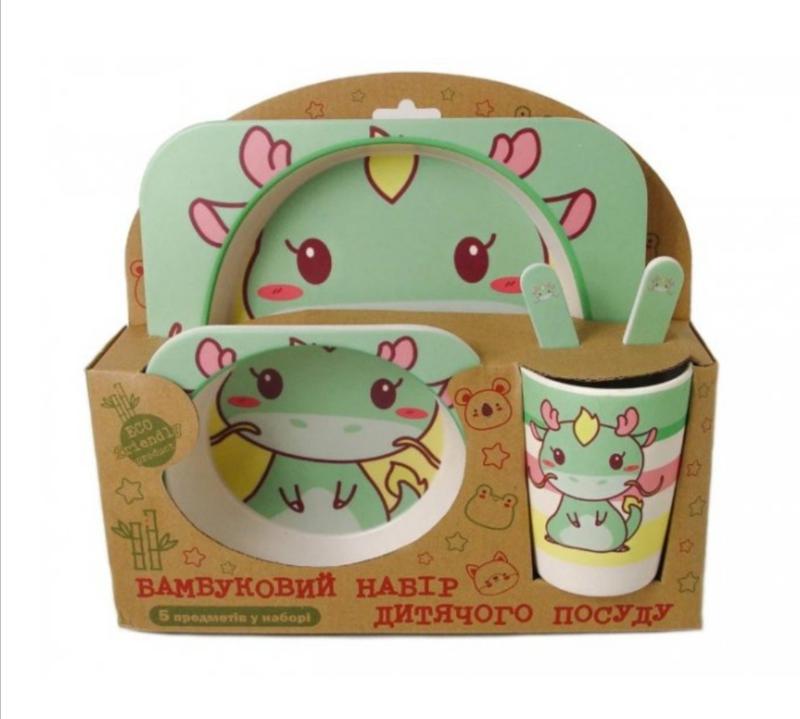 Набір дитячого бамбукового посуд. У набір входить: тарілка для першого, тарілка для іншого (має дві секції), стакан, ложка і виделка. Екологічно безпечний. Не можна використовувати в мікрохвильовій.