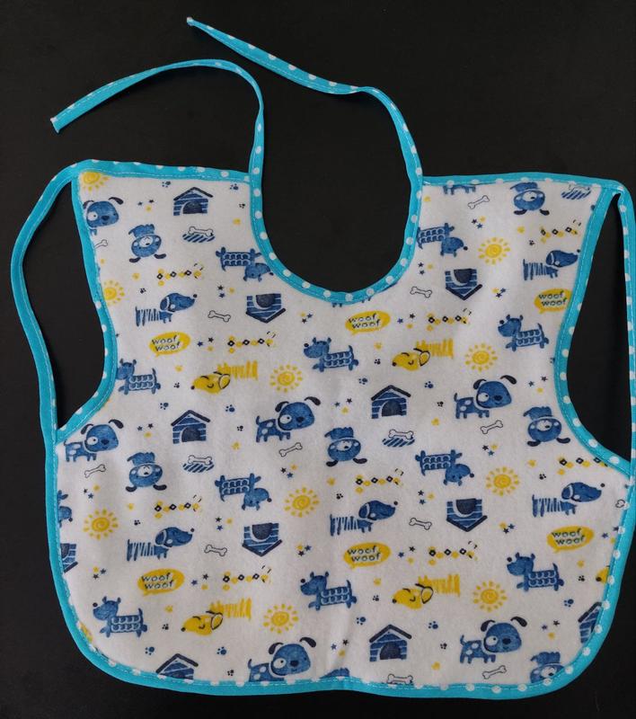 Дитячий фартушок слинявчик (нагрудник) непромокальний, багаторазового використання. Підходить для використання під час годування малюка. На зав'язках навколо шиї і на бретелях на плечах. Зав'язка і лямочки з трикотажної бейки, м'які і тоненькі, полотно моделі - начіс. Підкладка - непровокуюча клейонка (100% поліестр). В ідеальному стані. заміри: довжина 29см, ширина 31 см