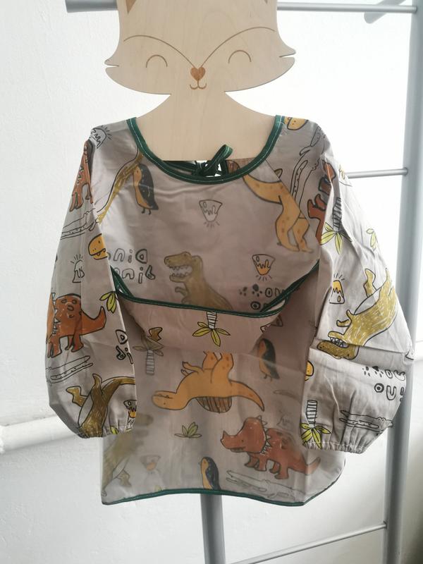 Дитячий слинявчик з довгим рукавом. Спереду має карманчик та клийончасту не промокаючу поверхню. Рукавчики та спинка бавовна Ззаду зав'язується та регулюється Розмір від 12 міс. до 3 років. До зросту 110 см