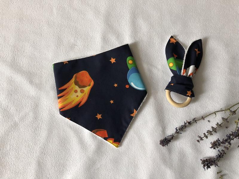 🌿Набір для малюка Слюнявчик непромокальний + гризунок з дерев'яним кілечком Колір: космос на синьому тлі Верхня частина слюнявчика з бавовни, внутрішня - бавовняна махра з непромокаючої мембраною. Слюнявчики на липучках Зручно використовувати: - коли малюк їсть; - ріжуться зубки, у цей період активно виділяються слинки; - як аксесуар доповнити образ Гризунок (прорізувач) з дерев'яним кілечком з дерева Бук і шарудять вушками. Розмір кільця 53 мм. Вушка легко знімаються для прання. Забарвлень багато, пишіть, скинемо