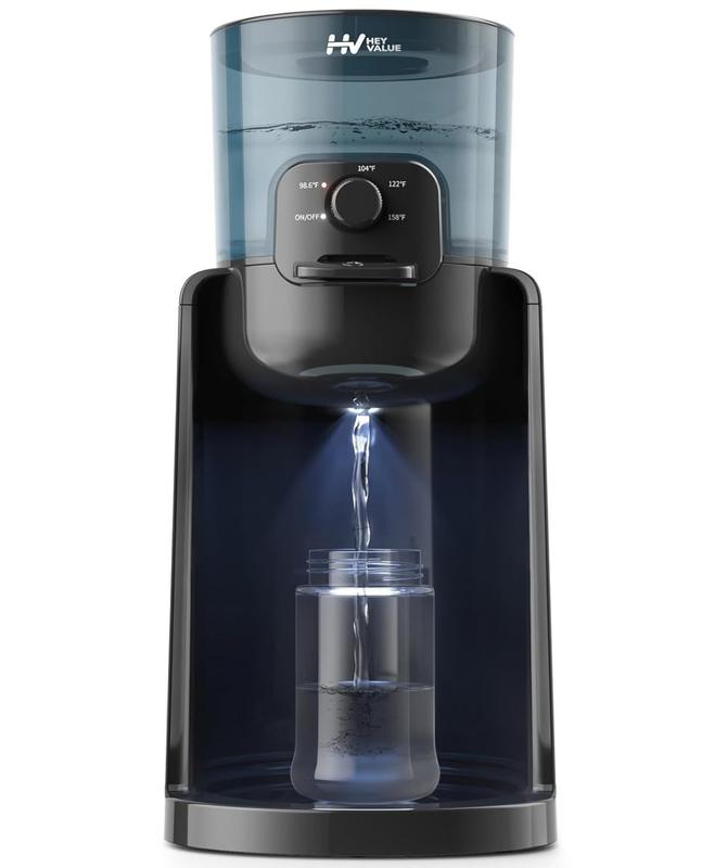 Подогреватель воды для детской смеси 📝 Описание товара Мгновенный нагреватель/диспенсер воды HEY VALUE (с регулировкой температуры). Компактный и удобный прибор для быстрого получения горячей воды без длительного ожидания, как в чайнике. Назначение: Идеально подходит для приготовления детских смесей, быстрого чая, кофе или других напитков. Регулировка температуры: Имеет возможность выбора фиксированных температур (например, 37°C, 40°C, 50°C, 70°C), что особенно удобно для детского питания или различных сортов чая. Использование: Рекомендуется использовать очищенную или дистиллированную воду для предотвращения образования накипи. Дизайн: Черный корпус с бирюзовым резервуаром для воды. уточнить спросить наличие товар активен на конец ноября 2025