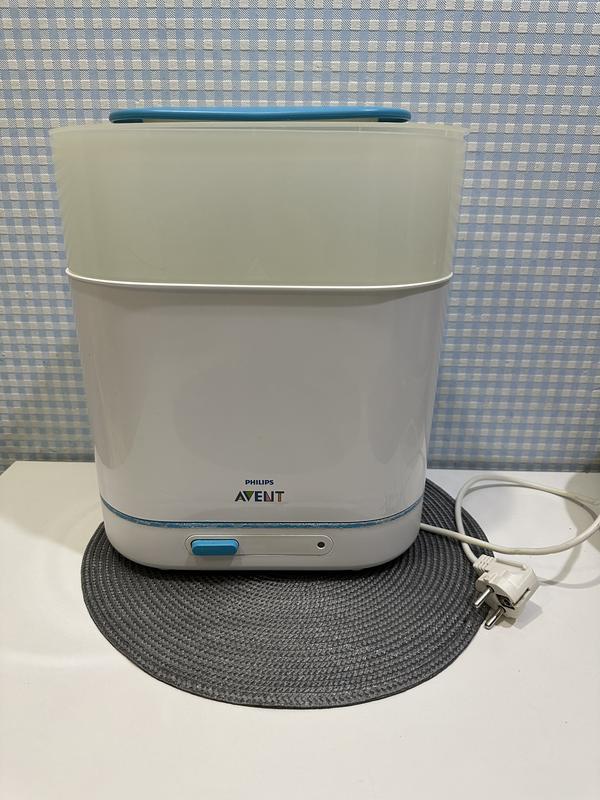 Стерилізатор в чудовому стані, нагріваючий елемент чистий, не ржавий, вміщує в себе 6 пляшечок, має додаткову полицю для стерилізації кришок, сосок…. Працює без нарікань. Є сліди від води на зовнішній частині, на роботу не впливає