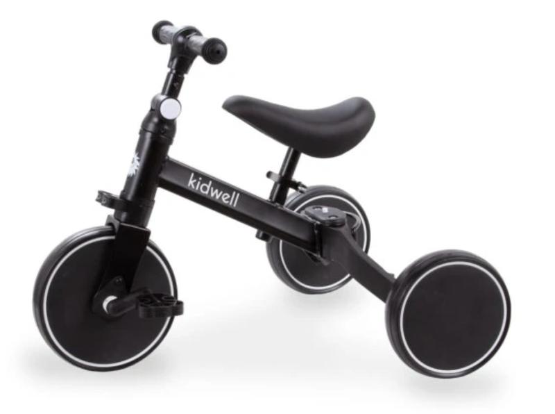 Велосипед PICO 3в1 от Kidwell - отличный выбор для постепенного обучения ребенка самостоятельной езде. Он сочетает в себе функции беговела и трехколесного велосипеда, что помогает малышу быстро и легко осваивать новые навыки. Этот велосипед предлагает три варианта использования: Режим езды – разверните задние колеса для большей устойчивости. Ребенок сможет уверенно отталкиваться ногами, развивая координацию и баланс. Режим беговела - сложите задние колеса в одно широкое колесо. Это поможет ребенку быстро научиться удерживать равновесие на двух колесах. Трехколесный велосипед — разложите задние колеса и закрепите педали. Меньше чем в минуту PICO превращается в стойкий трехколесник. Особенности модели: Надежная стальная рама обеспечивает безопасность во время катания. Простая и быстрая трансформация между режимами без использования инструментов. Современный спортивный дизайн. Рукоятки руля с амортизирующим покрытием, которые не скользят и защищают руки ребенка от травм. Регулировка высоты сидения для комфортного катания по мере роста ребенка. Трехступенчатая регулировка расстояния между рулем и сиденьем. Ограничитель поворота руля предупреждает падение при резких маневрах. Два задних колеса складываются в одно двойное для удобства. Колеса EVA размером 8” и 9” не требуют накачивания, работают тихо и подходят для использования даже в помещении. Эргономичное седло с мягким покрытием предотвращает скольжение и обеспечивает комфорт. Практичные ручки позволяют удобно хранить педали, чтобы они всегда были под рукой. Компактные размеры в сложенном виде облегчают транспортировку и хранение. Технические характеристики беговела: Рекомендуемый рост ребенка: 90–124 см Возраст: от 2 лет Материалы: стальная рама, EVA колеса, пластиковые детали Максимальная нагрузка: 25 кг Вага велосипеда: 2,9 кг На колесах виден след от езды, дополнительно, на трубке сиденья, делали отверстие, чтобы иметь возможность опустить ниже сиденья.