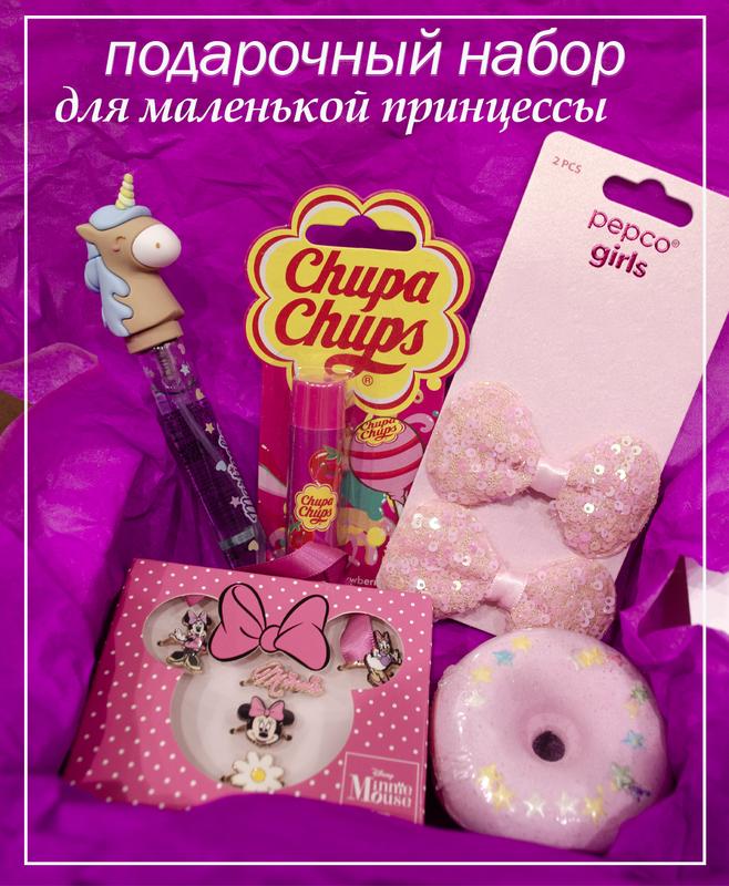 Подарунковий набір для маленької принцеси! Ідеальний подарунок, який подарує радість і казковий настрій кожній дівчинці! Що в наборі? 1️<unk> Шпильки з паєтками Яскраві та стильні аксесуари для волосся, які прикрасять будь-який образ. 2️<unk> Бальзам для губ "Чупа-Чупс" Зволожує й захищає губки, додаючи солодкого аромату веселощів. 3️<unk> Бомбочка для ванни у формі пончика Весела та ароматна пригода під час купання, що перетворює воду на маленьку казку. 4️<unk> Набір кілець Mini Чарівні прикраси, які дівчинка зможе носити щодня, відчуваючи себе справжньою принцесою. 5️<unk> Спрей для тіла Легкий аромат, який додасть нотку свіжості та веселощів. 🇪🇸 Продукція з Іспанії Висока якість і стиль у кожній деталі. 🎁 Чому цей набір ідеальний? Підходить для будь-якого свята: дня народження, Новий рік або просто як сюрприз без приводу. Кожен елемент набору принесе радість і захопить маленьку модницю. Натуральні компоненти, безпечні для дітей. 📦 Кількість обмежена! Замовте прямо зараз і потіште свою маленьку принцесу: Сяйте разом із вашими малюками!