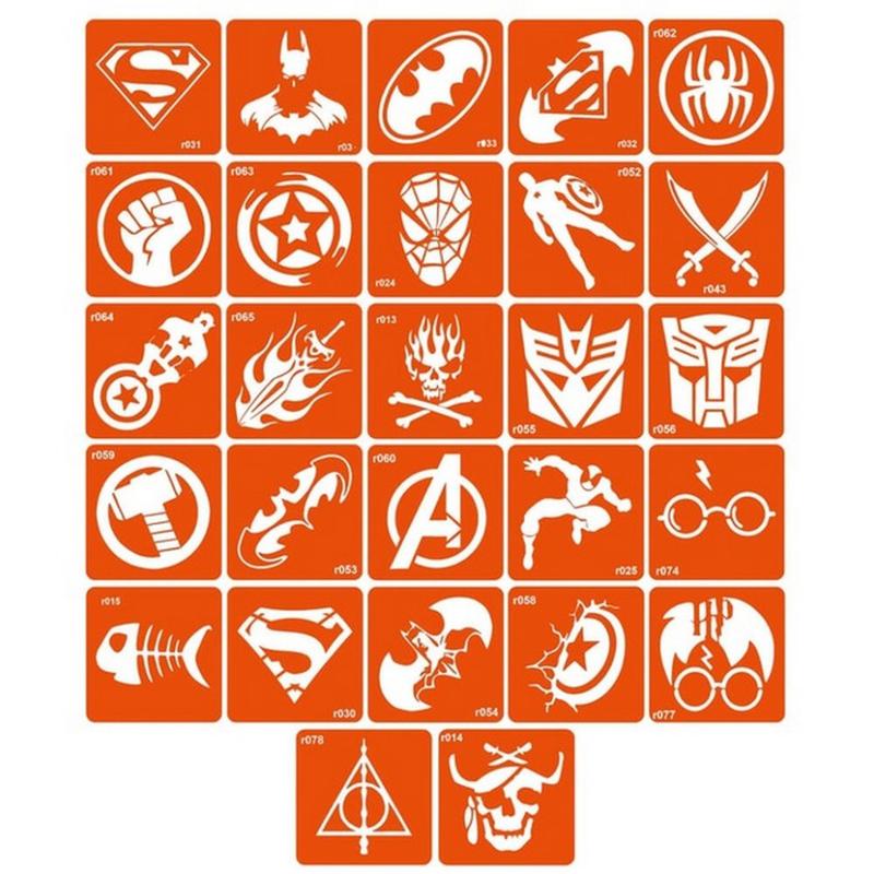 Коллекция простых трафаретов пиратов и супергероев, 27 трафаретов 5*5 см. Как сделать био-тату: выберите равномерный участок кожи; хорошо обезжирьте его; снимите с трафарета белую подложку (бумажная основа трафарета); приклейте трафарет на сухую и обезжиренную кожу; акуратно снимите прозрачную пленку и убедитесь, что трафарет (оранжевая часть) плотно приклеен к коже; нанесите равномерный слой клея для боди-дизайна и дайте ему просохнуть (от 30 секунд до 2 минут в зависимости от слоя клея); нанесите глиттер (блестки) на клей и плотно вбейте его кистью для глиттера; смахните излишки глиттера кистью- сметкой и снимите трафарет. Для чего нужен трафарет: если не умеете рисовать от руки; если нужно много и быстро рисовать; нужно создавать одинаковые и по размеру, и по внешнему виду рисунки - воспользуйтесь трафаретами Fresh Tattoo; трафареты Fresh Tattoo безопасны для кожи и подходят ля нанесения временных тату всех типов: глиттер-тату, хной, бархатом, пигментом, джагуа-гелем и так далее; подходят для химического или пескоструйного матирования изделий из стекла (чашки, бокалы, зеркала);