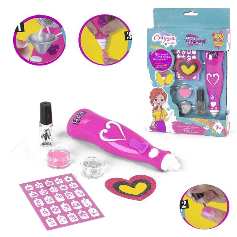 ## ## Детский набор для маникюра для девочек с ручкой дозатором с блестками для ногтей лаками Студія краси FUN GAME Набор для волшебного маникюра от «Fun Game» включает в себя все необходимое для создания модного маникюра себе и своим подружкам! Составляющие набора не содержат токсичных материалов и полностью безопасны для детского здоровья. В набор входит: - ручка-дозатор для нанесения блесток; - пилочка; - флакончик прозрачного лака; - наклейки для маникюра; - 2 вида блесток; - воронка для блесток; Ручка дозатор работает от 2-х батареек типа «ААА» 1.5V (не входят в комплект). Размеры/габариты Детского набора для маникюра для девочек: Размеры/габариты - длинна (см): 2.5 см - ширина (см): 3 см - высота(см): 18 см Размер упаковки: 18 см × 4 см × 29 см Упаковка: Коробка Возраст: от 3 лет Проверка и упаковка перед отправкой. Отправка ежедневно. Варианты оплаты: Оплата наложенным платежом при получении на Новой Почте без предоплаты. Наличными при доставке. Предоплата на карту - оплачиваете только стоимость товара. Все наборы детской косметики можно посмотреть по ссылочке ниже: Наборы косметики и наборы для маникюра и педикюра для девочек
