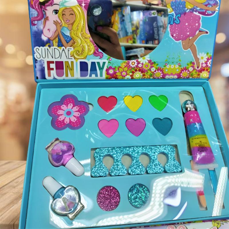Косметика дитяча IGOODCO Палетка тіней і гліттерів для повік з дзеркалом Набір декоративної косметики IGOODCO 16в1 у подарунковій коробці з магнітною застібкою. Палетка Fun Day makeup з 6 яскравих і 3 глітерних тіней для повік, блиску для губ, двох лаків для нігтів, роздільника для педикюру. Загалом цей набір дитячої косметики повністю укомплектований та допоможе дівчаткам створити яскравий та стильний образ з ніг до голови. Разом із цими відтінками модниці зможуть створити найтрендовіші образи. Компоненти, що входять до складу, не містять токсичних матеріалів і повністю безпечні для здоров'я Вашої дитини. Косметика легко змивається водою із милом. Koсметичний набір буде формувати у дівчинки індивідуальний естетичний смак, риси охайності і привчатиме її до акуратності. Тіні виготовлені з високоякісних та екологічно чистих матеріалів. Не викликають алергічної реакції. Легко змиваються з тіла та одягу. Для дітей віком від 6-ти років. У набір входить 16 предметів: - ### 6 відтінків тіней. - ### 3 глітери. - ### Блиск для губ. - ### 2 лаки. - ### Аплікатор для тіней - 2 шт. - ### Дзеркальце. - ### Роздільник для пальців. Розмір палетки: 23*17,2*2,8 см Шановні клієнти, відправляючи Вам товар, ми його пакуємо самостійно, щоб Ви не переплачували за упаковку на пошті, а платили лише доставку. Це дозволяє заощадити від 20 до 120 грн. залежно від обсягу посилки.