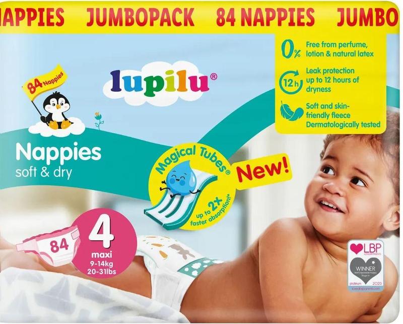Подгузники Lupilu - это защита от протеканий даже при интенсивных движений ребенка. Особенности: - хранят в сухом состоянии до 12 часов, - позволяют коже дышать, - здоровая детская кожа благодаря тройным абсорбирующим каналам, которые хорошо впитывают и разпределяет влагу, оставляя ее сухой надолго, - без латекса, - внутренняя ткань мягкая, как хлопок, - супер поглощающий эффект, - дерматологически проверенные, - призваны снизить риск возникновения аллергической реакции, - красочный дизайн. Подгузники Lupilu имеют положительную отличие Европейского Института матери и ребенка.