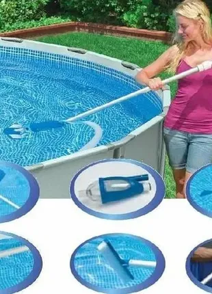 Описание Набор для ухода за бассейном Intex 28003 Пылесос Intex 28003 для очистки дна и стенок бассейна от насоса 2 028 л/ч Комплектация набора для ухода за бассейном Intex 28003 : - Сачок - 1 шт; - Щетка- 1 шт; - Пылесос- 1 шт; - Шланг- 1 шт; - Адаптеры- 1 шт; - Телескопическая ручка.- 1шт. Пылесос Intex 28003 подходит к каркасным и надувным бассейнам. Работает от насоса мощностью от 2028 л/ч и более. Функция: очистка дна, стенок, поверхности Диаметр шланга: 32 мм Длина шланга: 750 см Диаметр совместимости: 28 мм Длина ручки: 279 см Подключение : - На плунжерных кранах бассейны от 488 см. Intex и BestWay. - На хомутах бассейны до 457 см. Intex и BestWay (необходимо приобрести форсунку Intex 11070) Комплектация и особенности набора для ухода Intex 28003 за бассейном: Насадка-пылесос для ровной поверхности: Intex 11445 (очистка дна бассейна от механической грязи и слизи). Подсоединяется к колбе для сбора мусора, которая подсоединена к фильтр-насосу через шланг Работает от: фильтр-насоса. Диаметр совместимости: 28 мм Насадка-пылесос для труднодоступных мест- очистка углов и стыков бассейна от механической грязи Подсоединяется к колбе для сбора мусора, которая подсоединена к фильтр-насосу через шланг. Работает от фильтр-насоса. Диаметр совместимости: 28 мм Ручка телескопическая Intex 29055: длина 2.79 м, механизм фиксации Шланг Intex 10797: длина 7 м, диаметр 32 мм Мешок для мусора: Intex 10788 (из мелкой сетки, заменяемый) Адаптер для пылесоса: Intex 11447 Сачок: очистка поверхности воды от плавающего мусора Подсоединяется к телескопической ручке (Intex 29055) Щетка: очистка дна от грязи и очистка стенок и дна бассейна от слизи, Подсоединяется к телескопической ручке (Intex 29055) Инструкция Вес: 3.7 кг Упаковка: полноцветная коробка 113.5 x 30.5 x 13.5 см