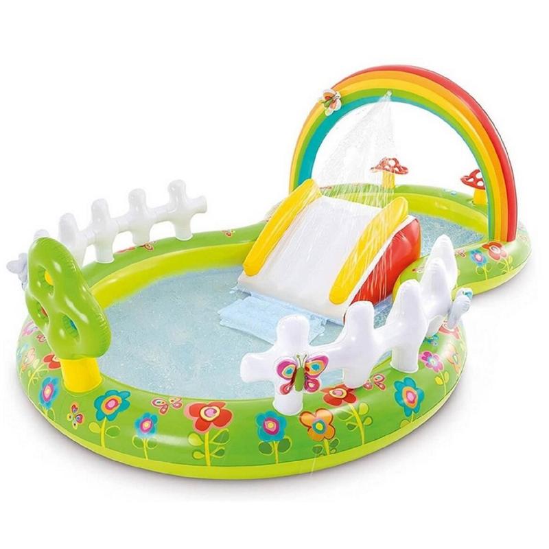 Бассейн надувной - игровой центр Intex "Мой сад". 290х180х104 см, 450л. Multicolor (99251) Игровой центр "Мой сад" с горкой и распылителем, 290х180х104 см, от 2 лет Игровой центр "Мой сад" состоит из двух раздельных бассейнов. Объём бассейнов 450 л. Высота бассейнов 13 см. Надувная горка смачивается водой через брызгалки для лучшего скольжения. Под горкой прикреплена надувная подушка для безопасного спуска. В комплекте идет 2 надувных гриба, 4 бабочки и 3 мяча. Характеристики: - Размер: 290х180х104 см - Объём бассейна (13 см): 450 л - Максимальная нагрузка: 54 кг - Материал: винил, толщина винила 0,30 мм - Ремонтный комплект - Сливной клапан Общие характеристики: - Производитель: Intex - Страна производитель: Китай - Возраст: От 2 лет - Вид: Надувной игровой центр - Тип: Открытый - Форма: Круглый - Цвет: Разноцветный - Материал: Винил - Максимальная нагрузка: 54 кг. - Материал толщина: 0,30 мм - Размер упаковки: 40 × 48 × 13 см - Упаковка: Коробка