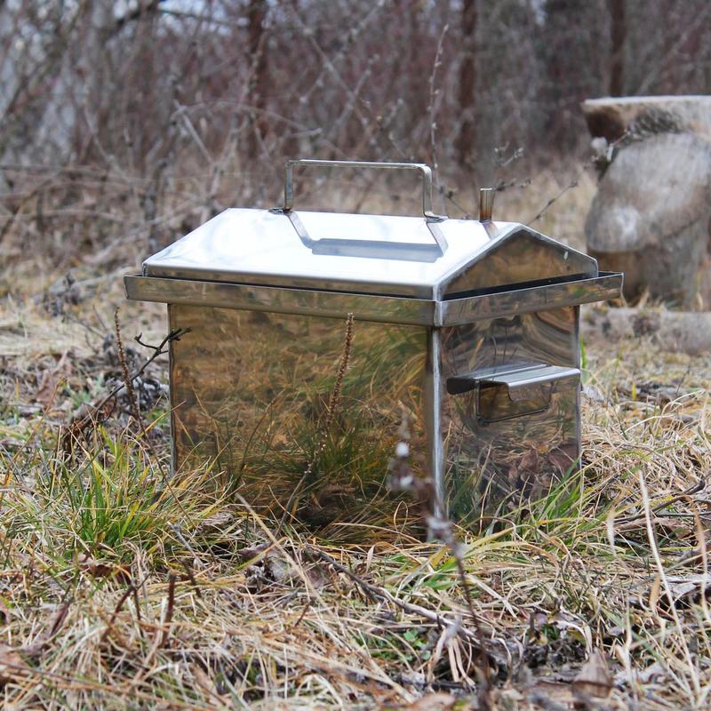 Коптильня Мала з гідрозакривом для гарячого копчення. Виготовлена з неіржавкої сталі завтовшки 1,5 мм, двоярусна. Складається з коробки коптильні, піддона для збирання жиру та двох сіток для укладання продуктів. Габаритні розміри: - довжина 350 мм. - ширина 255 мм. - висота 270 мм. Розміри коптильної камери: - довжина 300 мм. - ширина 200 мм. - висота 220 мм. Розове завантаження продуктів — 3-4 кг. Вага коптильні — 6.35 кг. За допомогою біметалевого термометра для копчення Ви повністю регулюватимете процес копчення, що мінімізує можливість помилки. Термометр – 240 грн.
