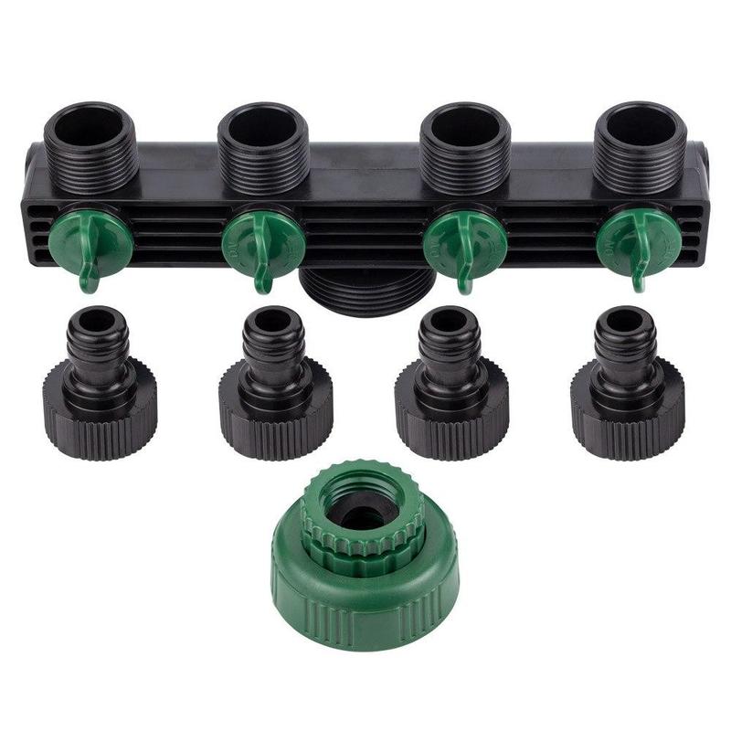 Кран розподільний з адаптерами 1/2" 4-е виходу в/р 1/2"×3/4" (5016905) дозволяє без особливого зусилля з'єднувати або роз'єднувати різні пристрої і механізми системи поливу. Характеристики: Ударостійкий пластик Внутрішня різьба підстави 1/2" і 3/4" 4 запірних клапана для регулювання напору води