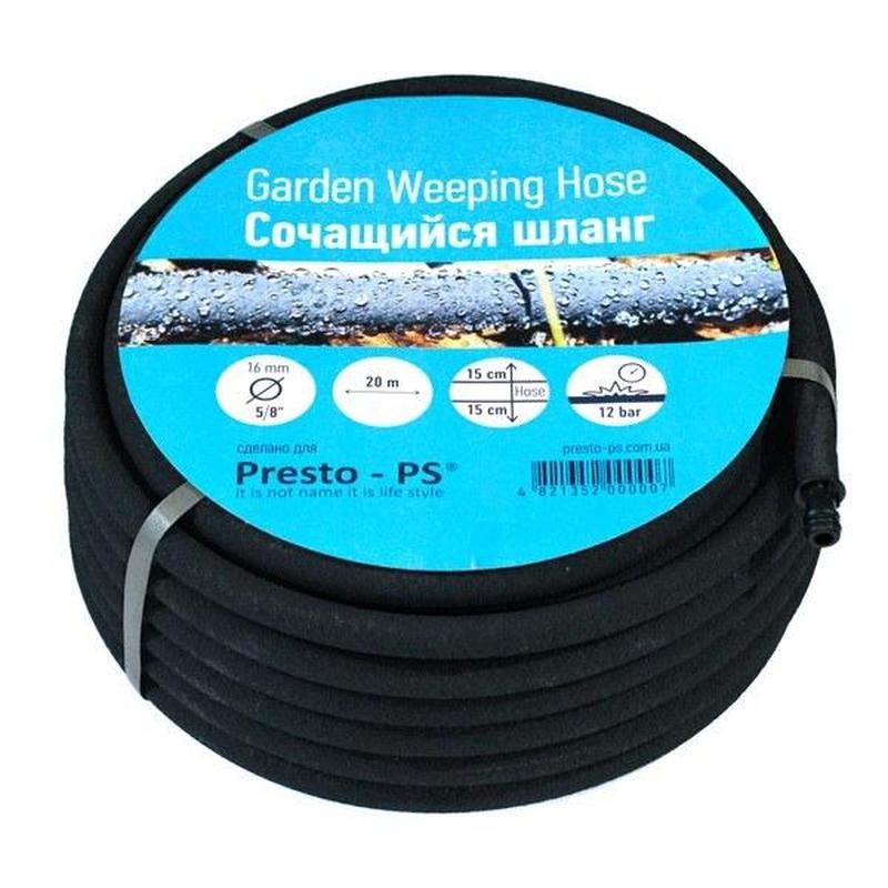 Особливості Шланг, що сочиться Presto-PS (1352) діаметром 16 мм (5/8") завдовжки 20 метрів виготовлений з високоякісного пористого ПВХ. Він стійкий до дії води, прямих сонячних променів. Щільна стінка шланга завтовшки 2 мм робить шланг не схильним до зминання і перегинів. Це дає можливість його підземного використання на глибині до 15-20 см, за якого досягається економія витрат води до 70% за рахунок відсутності її випаровування з поверхні ґрунту, що характерно для стандартних способів зрошення. За наземного варіанту застосування витрата знижується до 50% завдяки використанню крапельного, а не струменевого методу поливу. Витрату води можна регулювати в широких межах від 1 до 25 літрів на годину на погонний метр залежно від тиску в системі. Працює шланг навіть за відсутності централізованого водопостачання з ємності на висоті від 1,5 метрів. Стійкий до механічних пошкоджень у процесі експлуатації. Не схильний до деформації, розтягування і виникнення розривів при тиску до 3 атмосфер. Не містить у своєму складі шкідливих для здоров'я людини і навколишнього середовища домішок. Використовуються ці шланги для краплинного зрошення густо посаджених рослин, наприклад полуниці або овочевої розсади, на відкритому ґрунті та в парниках. Для поливу декоративних рослин, чагарників і квітників у ландшафтному дизайні. Унікальні риси шланга Presto-PS, що сочиться Шланги, що сочаться, відносяться до групи товарів для крапельного поливу і використовуються як економічна альтернатива стандартним струменевим методам зрошення. Дрібнопориста структура стінки дають змогу локально зволожувати ґрунт біля рослини без зміни його природної структури і рихлості. Це позитивно позначається на стані та зовнішньому вигляді рослин, прискорює їхній ріст, роблячи Вашу ділянку завжди красивою і свіжою. Завдяки щільній, стійкій до механічних навантажень структурі, можливе підземне використання таких шлангів. Це дає значну економію води і покращує естетичний вигляд зрошуваної території, що дуже важливо для створення ідеального дизайну газону або альпійської гірки. При цьому вони не мнуться під вагою ґрунту і не засмічуються твердими частинками, що містяться в ньому. Всі ці якості роблять шланги, що сочаться, незамінними в багатьох ситуаціях, де звичайні методи не дають достатнього ефекту. Переваги - Не мнуться, можливе підземне використання; - Економна витрата води; - Оптимальне зволоження зі збереженням структури ґрунту; - Регульована витрата води; - Можливість поливу з ємності без насоса; - Стійкі до деформацій і розривів; - Не схильні до впливу ультрафіолету; - Готові до використання відразу після купівлі, фітинги для підключення йдуть у комплекті; - Можливість простого подовження гілки поливу; - Тривалий термін експлуатації. Застосування - Зрошення невеликих ділянок газонів і кущів; - Вирощування квітів і розсади в теплицях і парниках; - Організація підземного поливу в ландшафтному дизайні.