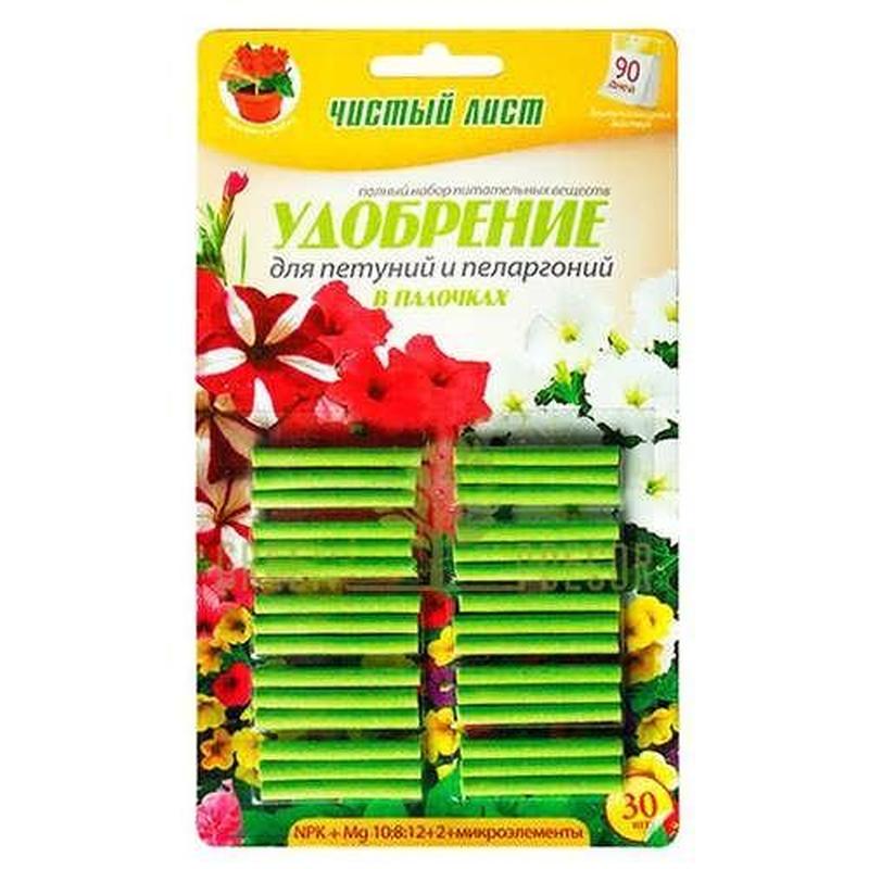 Добриво тривалої дії «чистий лист» для петуній, сурфіній та пеларгоній в паличках 30 шт