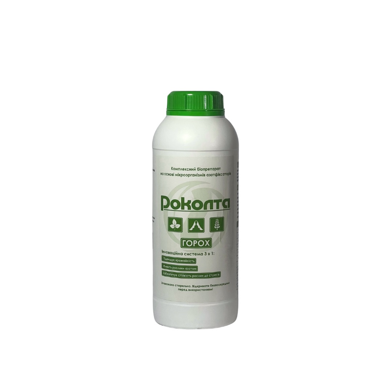 Роколта горох - це двокомпонентний рідкий препарат (інокулянт +активатор мікроорганізмів Протегер) для передпосівної інокуляції насіння сої на основі культури бульбочкових бактерій. Штам Rhizobium leguminozarium титром не менше 5х109 КУО/мл та активатором мікроорганізмів (полісахариди , комплекс макроелементів). Протегер - активатор мікроорганізмів для підвищнення ефективності обробки насіння біопрепаратами. (полісахариди , комплекс макроелементів). Механізм дії: Біотехнологічний препарат пролонгованої дії на основі біологічних полімерів та органо-мінерального середовища сприяє підвищенню ефективності обробки насіння зернових, зернобобових та технічних культур біологічними препаратами. Містить природну липкогенну композицію та спеціальне поживне середовище, які підвищують ефективність біопрепаратів, поліпшують виживання мікроорганізмів на насінні та захищають їх від негативного впливу зовнішніх факторів. Умови застосування: Препарат застосовують для передпосівної інокуляції насіння. Обробка насіння проводиться у закритих приміщеннях або під навісом, щоб попередити попадання на препарат чи оброблене насіння прямих сонячних променів. Також є в наявності 0.5 л