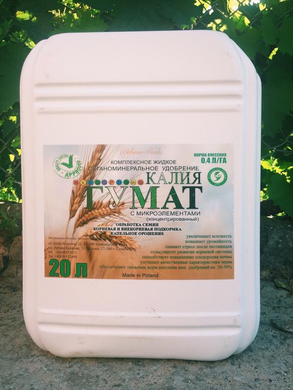 Гумат калия с микроэлементами (концентрированный) Гумат Калия позволяет уменьшить норму внесения минеральных удобрений на 30-40%, что значительно снижает себестоимость для сельхозпроизводителя, а также способствует восстановлению плодородия почв сельскохозяйственного назначения, увеличивает урожайность на 20-80%, уменьшает содержание нитратов, повышает устойчивость растений к неблагоприятным факторам. Норма внесения составляет: 0,4 л/га. Основным действующим веществом препарата «Гумат калия» являются активные формы гуминовых кислот, которые аккумулируют органические вещества почвы: аминокислоты, углеводы, пигменты, биологически активные вещества и лигнин. В солях гуминовых кислотах концентрируются также элементы минерального питания почвы,на их молекулах быстро развивается почвенная микрофлора. Поэтому: 1. Гумат калия оказывают комплексное воздействие на почву, улучшая ее физические, химические и биологические свойства. При этом гуматы выполняют протекторную функцию, связывая тяжелые металлы, радионуклиды и органические токсиканты, препятствуя тем самым их попаданию в растения. 2. Препарат «Гумат калия» обеспечивает резкое повышение урожайности сельскохозяйственных культур, обладает фунгицидной активностью, защищая растения от фитозаболеваний. 3. Использование «Гумата калия» увеличивает устойчивость растений к таким неблагоприятным факторам окружающей среды как экстремальные температуры, засуха, избыточное увлажнение. 4. Внесение в почву «Гумата калия» уменьшает расходы сельскохозяйственного производства за счет значительного сокращения затрат на внесение дорогостоящих минеральных удобрений, повышает объем производимой с/х продукции и цену реализации, улучшая качество производимой продукции Культура Обработка в период вегетации 1 Пшеница озимая и яровая 2-х кратная обработка растений в период вегетации: 1-я в фазу кущения - начала выхода в трубку; 2-я в фазу цветения - начала молочной спелости. Рожь озимая Ячмень озимый и яровой Тритикале озимая Овес Сорго* *2-я в фазу выметывания метелки - цветения. Просо* Кукуруза на зерно 2-х кратная обработка растений в период вегетации: 1-я в фазу всходов -появления 3-5-ти листьев; 2-я через 20 дней после первого. Кукуруза на силос* *2-я и 3-я с интервалом в 10-15 дней. Гречиха 2-х кратная обработка растений в период вегетации: 1-я в фазу ветвления - начала бутонизации; 2-я через 10-14 дней после предыдущего. Горох 3-х кратная обработка растений в период вегетации: 1-я в фазу всходов - 3-5-ти листьев; 2-я в фазу 5-6-ти листьев -- бутонизации; 3-я в фазу цветения. Клевер 3-х кратная обработка растений в период вегетации: 1-я в фазу появления всходов; 2-я в фазу отрастания растений; 3-я в фазу стеблевания. Люцерна 3-х кратная обработка растений в период вегетации: 1-я в фазу всходов -отрастания растений; 2-я в фазу стеблевания; 3-я в фазу бутонизации. Вико-овсяная смесь* *2-я и 3-я с интервалом в 15 дней. Подсолнечник 3-х кратная обработка растений в период вегетации: 1-я в фазу всходов; 2-я 3-4-х пар настоящих листьев и 3-я с интервалом в 10-15 дней. Соя 3-х кратная обработка растений в период вегетации: 1-я в фазу всходов - образования первого тройчатого листа; 2-я в фазу стеблевания - начала бутонизации; 3-я в фазу начала цветения. Сахарная свекла 2-х кратная обработка растений в период вегетации: 1-я в фазу появления всходов - 2-3-х п