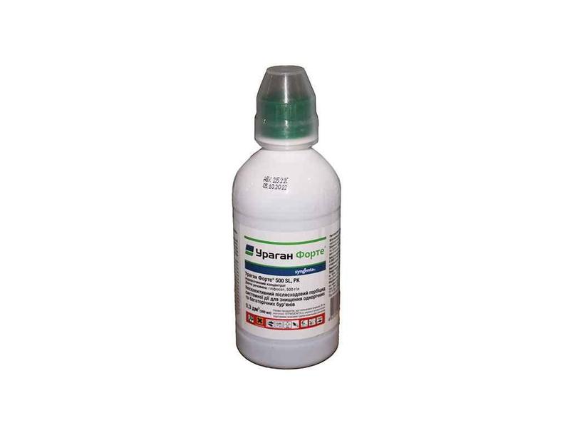 Ураган Форте® - неслективный походный системный гербицид сплошного действия для уничтожения однолетних и многолетних сорняков (соту, березки, пирог и др.), который изготовлен по технологии Hi-Tech. Ураган Форте® содержит уникальное поверхностно-активное вещество, которое обеспечивает наилучшее и наиболее быстрое действие глифосата. Препарат быстро проникает через листовую поверхность и распределяется по всему растению вместе с корневищем. Гибель наступает через 4-5 дней после применения, полная гибель — через 2-3 недели в зависимости от погодных условий. Лучший эффект достигается при активном росте сорняков в теплую погоду при температуре не ниже 15°С при достаточной влажности почвы. Оптимальная фаза развития сорняков для обработки: многолетние злаковые – минимум 4–5 лист при высоте 10–15 см; многолетние широколистые наиболее чувствительные в фазе цветения, но до начала старения; однолетние злаковые и широколиста – когда злаковые имеют длину листьев минимум 5 см, а широколистые – минимум 2 настоящие листики. Препарат относится к малотоксическим (ЛД50>2000 мг/кг). Нетоксичный для пчел, безопасный для окружающей среды. Срок ожидания после обработки: без ограничений.