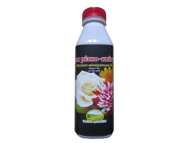 «Для різно-квітучих» Екстракт біогумусу. NPK 12-15-283MgО3SМЭ ( 350дм3- Розмір етикетки: висота 8 см. – ширина 21 см. ). 500дм3 _ 3%. Розмір етикетки: висота 13 см. – ширина 22 см. ТМ «ФАЙНЕ ДОБРИВО» Органо-мінеральне добриво. Застосовується для підживлення садових та кімнатних квітучих рослин, що вирощуються як у відкритому, так і в закритому грунті. Властивості: Сприяє рясному і тривалому цвітінню, забезпечує яскравий і насичений колір бутонів і листя. Сприяє пропорційному, здоровому розвитку всієї рослини, підвищує механічну міцність, забезпечує швидке зростання стебел і пишний листяний покрив. Зміцнює імунітет до різних грибкових і бактеріальних хвороб, а також до несприятливих умов навколишнього середовища. Спосіб використання: Позакореневе підживлення проводиться розчином для обприскування (4 ковпачка на 1л води) не менше 1 раз на 2 тижня. При захворюванні рослини 1 раз на 2 дні з інтервалом в один тиждень. Кореневе підживлення проводиться розчином 4 ковпачка на 1л води, з інтервалом 2-3 рази на місяць. Призначення: Для позакореневого та кореневого підживлення різно-квітучих культур, відкритого та закритого грунту. Методи внесення: Краплинне зрошування, полив, обприскування. Склад: NPK 12-15-283MgО3SМЭ ТУ У 24.1-2419717977-002:2008 Термін зберігання: 2 роки. Зберігати в прохолодному сухому місці. Зроблено в Україні. Місце виготовлення: Кіровоградська обл. Знам*янський р-н. с.Дмитрівка . Перед використанням збовтати. Для виготовлення добрив, використовується виключно вода зі свердловини, без хлору.