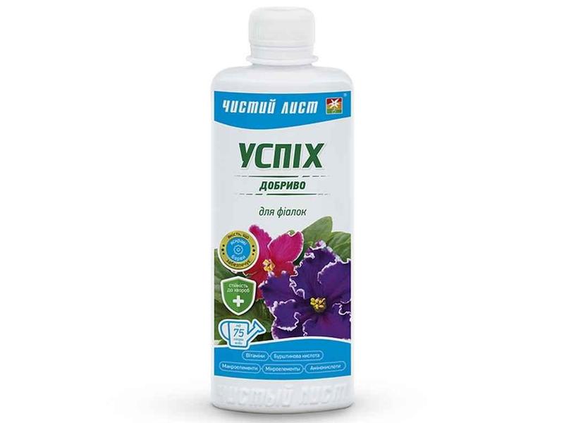 Область застосування і властивості «Успіх для фіалок» складне мінеральне добриво з комплексом біологічно активних речовин, що містить всі необхідні макро- та мікроелементи в доступній формі для повноцінного живлення, стимулює розвиток кореневої системи рослини, пригнічує розвиток патогенної мікрофлори. Підвищує стійкість до захворювань, запобігає розвитку хлорозу.