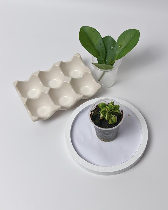 Набор - фикус ирэн (живец), фикус моккламе (свежозрез), декоративная подставка лоток для я...