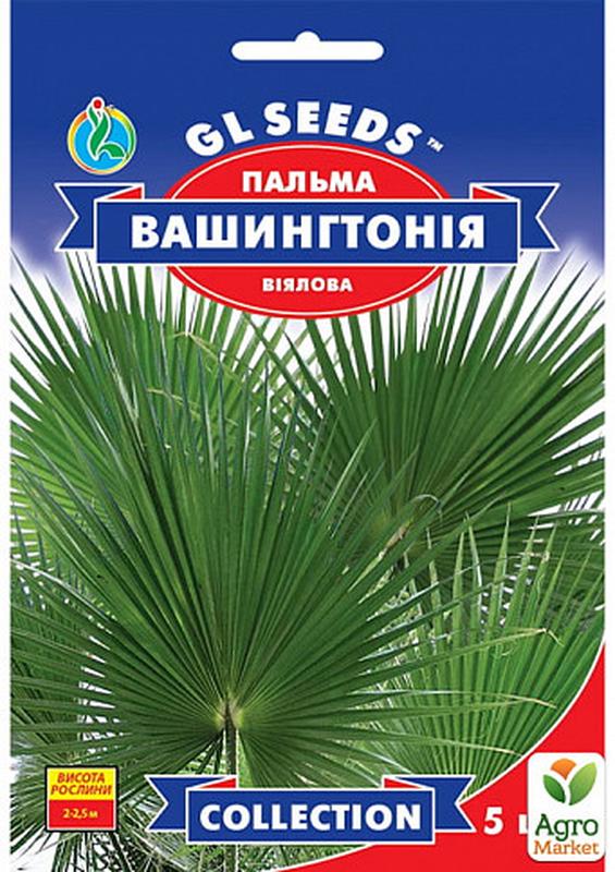 Пальма Вашингтонія Gl Seeds Елегантна швидкозростаюча віялова пальма. Використовується як кімнатна рослина для озеленення офісів і холів. Стовбур могутній, до 3 метрів заввишки, листя сіро-зелене, прикрашене білими ажурними нитками, біля черешка листя є шипи. Вирощується в домашніх умовах і в оранжереях За кілька років листя можуть досягати величини 1-1,2 м. Перед посівом насіння замочити в теплій воді. Пальма Вашингтонія інструкція та терміни посіву насіння 5 шт Висипати насіння на підготовлений ґрунт в лоток, присипати цією ж сумішшю ґрунтів на товщину, вдвічі перевищує діаметр насіння; Створити парниковий ефект, накривши плівкою або склом. Забезпечити температурний режим від 25 до 30 градусів, регулярне зволоження і провітрювання.