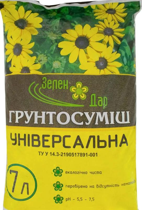 Грунтосуміш універсальна Флоріада Об'єм - 7л. Грунтосуміш універсальна готова до використання. Дрібна структура грунтосуміші забезпечує високу здатність поглинання вологи і проникнення поживних речовин. Продукція виготовлена на основі якісних компонентів. Cклад: дернова земля, торф верховий, торф низинний, річковий пісок, мінеральні добрива (N,P,K), мікроелементи( Fe, Zn, B,Cu, Mo, Mn). рН 5,5-7,5