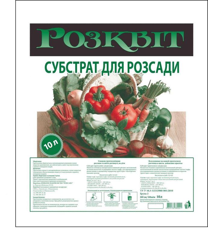Субстрат для розсади "Розквіт" - повністю готовий до використання поживний субстрат для розсади, виготовлений на основі екологічно та радіаційно чистого торфу для промислового і аматорського вирощування розсади найбільш поширених овочевих і квіткових культур, а також розмноження декоративних і плодово- ягідних культур живцюванням. Кислотність субстрату для розсади (pH): 5,5 - 6,5. Склад субстрату для розсади: торф верховий низького ступеня розкладання; торф низинний; агроперліт. Органічної речовини 60-80%, мікроелементи Fe, Mn, B, Cu, Zn, Mo. Поживні речовини в доступних для рослин формах, мг на 1 літр: Азот (NH4 + N03) - 100-140 мг. Фосфор (Р2О5) - 120-160 мг. Калій (К2О) - 140-180 мг.
