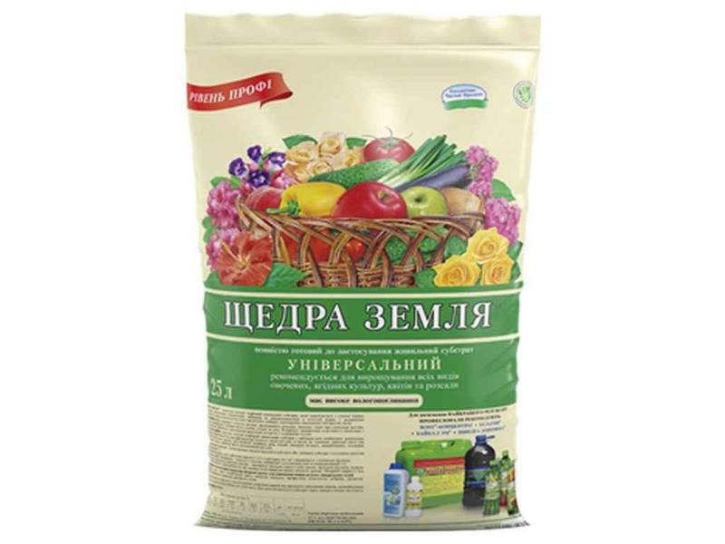 Діюча речовина: суміш торфів, подрібнений кокос, кокосове волокно, органічні домішки, перліт, вапнякові матеріали, пісок, добрива Властивості: покращує умови проростання насіння і приживлюваність розсади, живців та саджанців; сприяє коренеутворенню завдяки волого- та повітропроникній структурі; забезпечує розсаду елементами, необхідними для закладання генеративних органів; покращує декоративні властивості кімнатних рослин; забезпечує прискорений ріст та розвиток рослин; є стерильним від насіння бур’янів, шкідників і збудників захворювань. Щедра земля® – повністю готовий торф’яний живильний субстрат, який виробляється з суміші українських та прибалтійських торфів, збагачених макро- та мікроелементами (в хелатній формі), з додаванням подрібненого кокосу, кокосового волокна, органічних домішок, агроперліту, вапнякових матеріалів і піску. Суміш компонентів, збагачених макро- та мікроелементами, створює близькі до ідеальних умови ґрунту для вирощування рослин: поживні елементи, аерація, водопроникність і вологопоглинання, стерильність від шкідників, збудників хвороб та насіння бур’янів. Призначення: для висіву насіння, пікіровки та вирощування розсади овочевих, ягідних, квіткових та декоративних культур. Ефективність: покращує схожість насіння, приживаність розсади, зменшує стрес при пересадці рослин; підвищує врожайність і смакові якості овочів, плодів та ягід; покращує декоративні властивості кімнатних і садових рослин; забезпечує прискорений ріст, розвиток і дозрівання плодів. Добрива - 1,2 кг/м3 рН - 5,5-6,5 Компоненти: верховий, перехідний, низинний торф, подрібнений кокос, кокосове волокно, органічні домішки, перліт, вапнякові матеріали, пісок