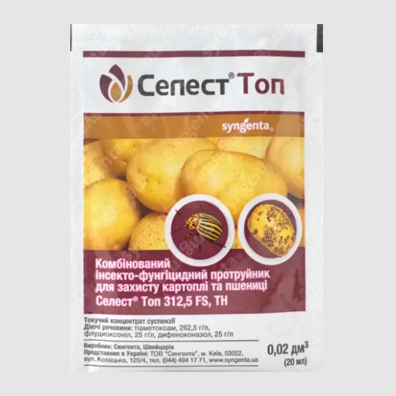 Протравник для картоплі Селест топ 312.5 FS т.к 20 мл Syngenta Швейцарія Комбінований інсекто-фунгіцид Селект топ застосовується для замочування посадкової картоплі для захисту від широкого спектра ґрунтових комах: колорадського жука, ти, трипси, совки, цвітеду, довгоносика, плодошкірки, пінільника, молі, листочки, мухи, блошки, білокрилки, кліща, лопови, щитівки, цикадки, склянки, мертведа, черв'яча, мотилька. Під час оброблення посівного матеріалу протравник Селист топ ефективний проти ризоктоніозу, фітофторозу, септориозу, оридиму, мільдюму, альтернаріозу, плямистості, антракнозу, іржі, хлорозу, борошнистої роси, бактеріозу, моноліозу, фомозу, альнатерозу, альнаріозу , трипороза, парші, макросогозу, фузаріозу, рингоспорозу, гнилів, цвілі. Наявність трьох активних речовин у складі препарату, як-от тіаметоксам, флунікосоніл, диференоназол, виключає виникнення резистентності у шкідників і патогенів, водночас препарат захищає картоплю впродовж 40 днів. Цей інсекто- фунгіцид застосовується для картоплі, озимої пшениці, рису, сої, ячменю озимого та ярового. Переваги препарату Селест топ Сингенту - Протравильник стійкий до змиву обсадками та низькими температурами - Засіб не накопичується в ґрунті та не проявляє фітотоксичності - Препарат має тривалий період захисної дії - Інсекто-фунгіцид контролює широкий спектр захворювань і комах Інструкція, спосіб застосування, склад і норма витрати протравника Селест топ 20 мл Сінгента Активна речовина: тіаметоксам 262.5 г/л, флюдіоксоніл 25 г/л, дифеньйоназол 25 г/л Оброблення клубнів за 12-48 годин до висаджування або під час саджання. Культура Норма витрати препарату, мл Норма витрати робочого розчину, л/стілку Шкідливі об'єкти Картопля (перед посадкою) 100 мл на 2 л води На 150 кг клубнів Парша (віди), фузаріоз, ризоктоніоз, альтернаріоз, фомоз. Ґрунтувані шкідники, колорадський жук, тлі Озима пшениця (перед посівом) 100 мл на 0,7 л води На 70 кг зерна Пильна головня, фузаріозно-гельмінтоспортизна коренева гниль, септоріоз, мурошиста роса. Хлібна жужелиця, злакові мухи, тилі, цикадки, хлібні блошки