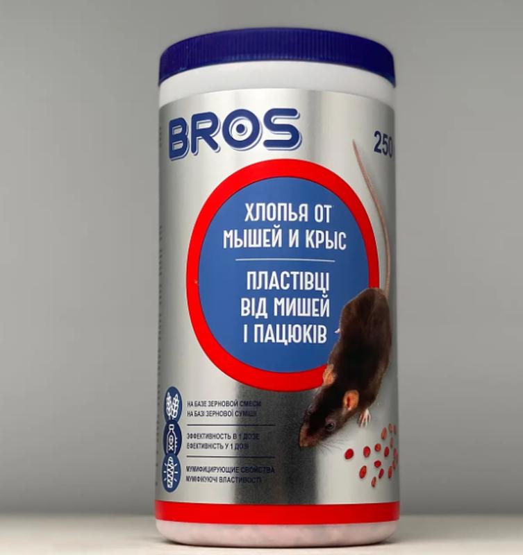 Гранули Bros від щурів і мишей 250 г. Родентицидний засіб проти щурів і мишей "Bros" Ефективний засіб у формі гранул від гризунів мишей і щурів. BROS гранули від мишей і щурів.🔹 Гранули для боротьби з мишами, щурами та іншими гризунами. Мають муміфікувальні властивості. Норма витрати: миші до 50 г гранул на кожні 1 Гранули від мишей і щурів Bros 250 г (Брос) — це високоефективний і швидкодійний засіб, спеціально розроблений для ефективного знищення гризунів у вашому домі, на складі або в будь-якому господарському приміщенні. Цей продукт гарантує високу якість боротьби зі шкідниками завдяки своїм унікальним характеристикам. Характеристики гранул Килим від мишей і щурів - Бренд – Bros; - Призначення — системний родіцид для знищення мишей і щурів; - Сфера використання — для побутових і промислових приміщень і присадибних ділянок; - Форма — зернова приманка; - Тип — родіциди; - Активна речовина — Бромадіолон 0,005% (0,005 г/100 г) - Термін повного знищення — 10-15 днів; - Вага — 250 г; - Країна-виробник — Польща. Однією з ключових переваг гранул Bros є його висока смакова привабливість для мишей і щурів, що гарантує максимальний результат. Завдяки експлуатованій дії препарату гризуни споживають гранули та навіть не підозрюють про їх утримання, тому загибель шкідників настає через 4-5 днів після споживання гранул. Це дає змогу уникнути підозрілості в решти популяції гризунів. Важливою особливістю препарату польського виробництва кидан є його механізм дії — гризуни гинуть через зневоднення. Ця унікальна властивість препарату допомагає уникнути неприємного запаху, оскільки гризуни муміфікуються після смерті. Не менш важлива наявність спеціальної гіркої речовини в складі, яка допомагає запобігти випадковому ковтанню гранула людьми або свійськими тваринами, гарантуючи безпеку використання. Спосіб використання гранул від гризунів Bros Для боротьби з гризунами ретельно розсипте препарат відповідно до рекомендованого дозування, використовуючи чистий посуд і засоби індивідуального захисту для вашої безпеки. Для досягнення найкращих результатів рекомендується дотримуватися рекомендованого дозування: - Для мишей — розсипте порцію 20-25 г гранул на площі приблизно 20 м2. - Для щурів — використовуйте 50-100 г гранул залежно від розміру та ступеня поширення гризунів. Повне знищення популяції гризунів буде досягнуто через 10-15 днів після застосування препарату, що робить Bros одним із найефективніших засобів боротьби зі шкідниками на ринку. Звертаємо вашу увагу на важливість використання ємностей без запаху для розсипання гранул, а також наявність індивідуальних засобів захисту під час роботи з препаратом. Не використовуйте столовий посуд! Купити гранули від мишей і щурів Bros 90 г (Брос) за доступною ціною пропонуємо в інтернет-магазині «Полуб рослинінь». Оперативна доставка якісних товарів від провідних європейських брендів виробляється надійними поштовими службами в будь-який населений пункт України. 0 м2; щури до 100 г на кожні 10 м2. Виробник: Польща