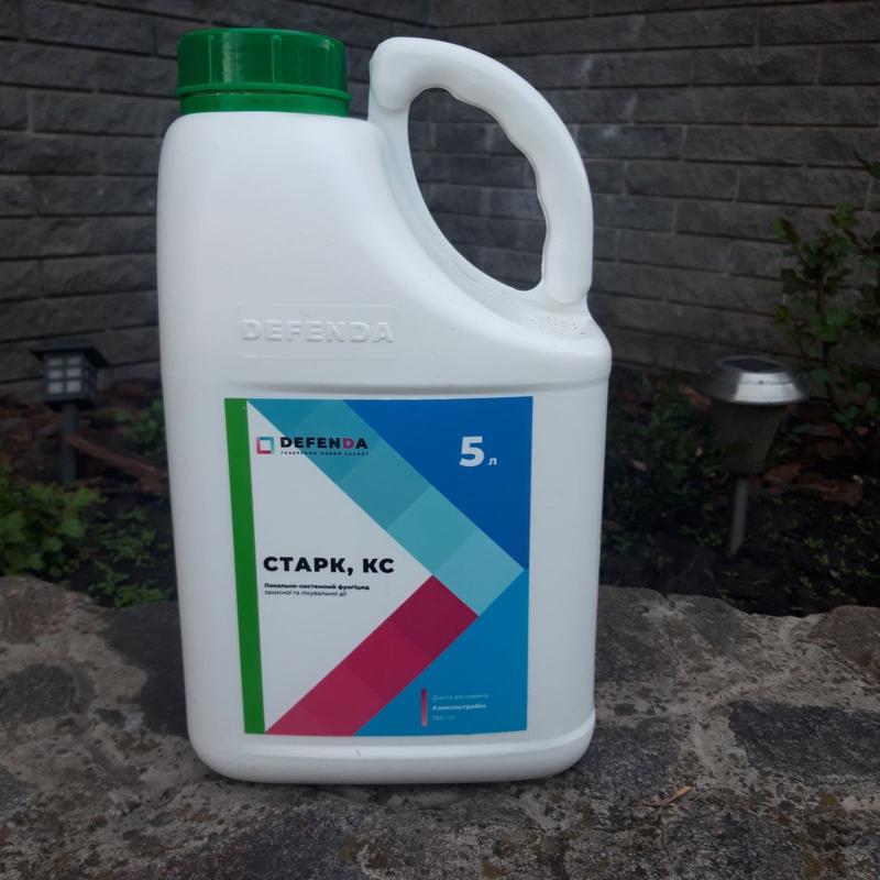 Старк - системний фунгіцид широкого спектру дії для захисту соняшнику, кукурудзи, сої, гороху, пшениці, винограду, овочів і хмелю від комплексу хвороб. Діюча речовина: Азоксистробин 250 г/л. Хімічна група: Стробілуріни. Тара: Пластикова каністра 5 л. Переваги препарату: Ефективний проти 4 класів грибів: Ascomycetes, Basidiomycetes, Deuteromycetes, Oomycetes; Безпечний для рослин, споживачів та довкілля (строки очікування для овочів становлять лише 5 днів) Належить до малотоксичних препаратів, нетоксичний для бджіл; Тривалість захисної дії - 12-14 днів. Норма витрати робочого розчину: 200 - 300 л / га. Найкраще дія фунгіциду спостерігається на початкових етапах розвитку хвороби; Антиспорулюючу та інгібуючу дію на спори патогена (практично миттєве дію протягом години); Період захисної дії препарату 7-14 діб в залежності від культури, інфекційної навантаження, погодних умов і агротехніки; Інгібує проростання кондидий на поверхні листа, знищує міцелій патогена в середині листа, а також перешкоджає утворенню спор патогена; Фунгіцидну дію супроводжується яскраво вираженим «Грін ефектом»