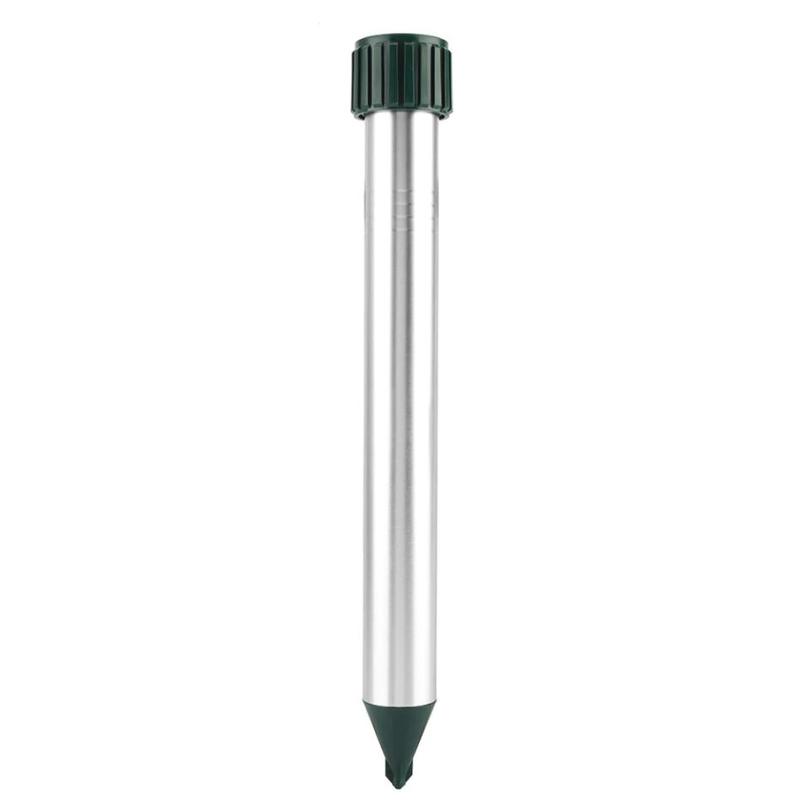 Відлякувач Sonic - це надійний та ефективний засіб для боротьби з кротами, полівками, капустянками, сліпаками та зміями. Випромінює звук з частотою 300 - 700 Гц, який відлякує шкідників з ділянки. Алюмінієвий корпус та пластикова кришка, що щільно закручується, з ущільнювачем надійно захистить прилад від впливу навколишнього середовища. Відлякувач виробляє звукові вібрації, які змушують кротів покинути дільницю. Середній радіус зони дії навколо встановленого приладу до 16 метрів. Однак на шляху поширення вібрації не повинно бути ніяких перешкод. Для досягнення найкращих результатів на великих територіях рекомендується встановлювати два відлякувача гризунів на відстані 16 метрів один від одного. У разі замерзання або затоплення ґрунту необхідно витягти відлякувач. Відлякувач кротів рекомендується встановлювати в місцях найбільш частої їх появи. Прилад не чинить негативного впливу на земляних черв'яків і жуків. Площа ефективного розповсюдження сигналу до 800 кв.м (в залежності від типу ґрунту). Працює 4-6 місяців на 4 батареях типу D R20, в комплект не входять.