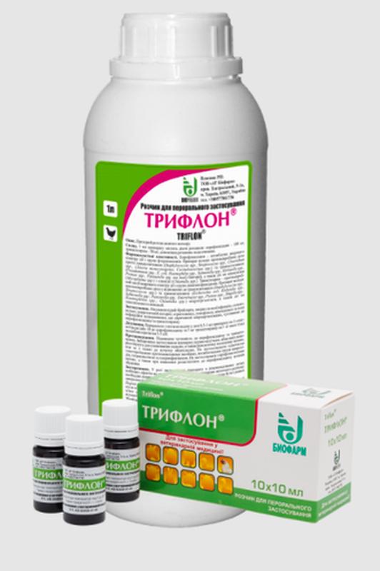 Розчин для орального застосування. Ефективний проти широкого спектру мікроорганізмів Потужна комбінація проти E. coli та Staphylococcus spp. Швидко всмоктується з шлунково-кишкового тракту Не викликає токсичних явищ при передозуванні Відмінно розчиняється у жорсткій воді Опис Прозорий розчин жовтого кольору. Склад 1 мл препарату містить діючі речовини: енрофлоксацин - 100 мг; триметоприм - 50 мг; допоміжні речовини - до 1 мл Застосування Препарат Трифлон застосовують для лікування інфекційних захворювань птиці, обумовлених бактеріальною мікрофлорою, чутливої до енрофлоксацину та триметоприму: колиинфекция, сальмонельоз, некротичний ентерит, стрептококкоз, гемофилез, мікоплазмоз та інші. Зберігання Препарат зберігають у транспортній тарі, в критих складських приміщеннях, в темному, сухому місці при температурі від +5 до + 25°С. Термін придатності 3 роки. Термін придатності після розчинення – 24 години.
