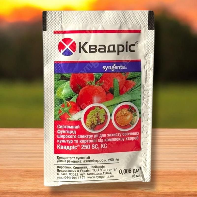 Фунгицид системного действия Квадрис Контактно-системный фунгицид широкого спектра действия с профилактическими и лечебными свойствами используют для защиты сельско-хозяйственных культур от грибковых заболеваний. Активное вещество препарата - азоксистробин - обеспечивает проникновение средства в растение, уничтожая патогены даже в сложнодоступных и необработанных местах. Продукт распространяется по растению и защищает все его части от повторного заражения грибковыми спорами. Механизм действия азоксистробина заключается в подавлении митохондриального дыхания патогенных клеток и блокировке передачи электронов в цепи цитохромов. Данный фунгицид наиболее эффективен на ранних стадиях инфекции, так как останавливает прорастание конидий, начальный рост мицелия и предотвращает образование спор. Искоренительное действие препарата помогает предотвратить распространение инфекций и развитие болезней на участке. Квадрис не только лечит и защищает растения от фитопатогенов, но и увеличивает период плодоношения на 2-3 недели. Использование препарата во время сбора урожая овощей значительно улучшает их хранение в хранилищах и домашних условиях. Фунгицид Квадрис применяют для защиты винограда, гороха, капусты, картофеля, огурцов, томатов, хмеля, лука от милдью, оидиума, серой гнили, черной пятнистости, инфекционного засыхания, пероноспороза, мучнистой росы, аскохитоза, фитофтороза, альтернариоза, антракноза, бурой пятнистости, фузариозного увядания. Преимущества фунгицида Квадрис - Препарат обладает эффективным лечебным действием благодаря азоксистробину - Фунгицид обладает длительным периодом защитного действия - Помимо профилактической защиты и лечения растений, средство продлевает плодоношение культур на 2-3 недели - Данный фунгицид увеличивает урожайность и улучшает внешний вид и качество выращиваемых культур - Средство усиливает и продлевает фотосинтез растения - Растения лучше переносят нехватку влаги в почве и воздушную засуху - Препарат не токсичен для пчел и окружающей среды Инструкция, способ применения, состав, дозировка и норма расхода фунгицида Квадрис Действующее вещество: азоксистробин 250 г/л. Культура Норма расхода препарата, мл/5 л Норма расхода рабочей жидкости, л/сотку Болезни Картофель 6 5 Фитофтороз, альтернариоз Огурцы 6 5 Ложная мучнистая роса, антракноз, мучнистая роса Томаты 6 5 Фитофтороз, альтернариоз, бурая пятнистость Лук 6 5 Пероноспороз, гнили, фузариозное увядание Фунгицид Квадрис совместим с большинством фунгицидов и инсектицидов. Рекомендуется применять в комплексной системе защиты с фунгицидами Ридомил Голд МЦ, Топаз. В каждом конкретном случае следует проводить тесты на совместимость. Баковые смеси с гербицидами не рекомендуется, потому что не совпадают сроки применения.
